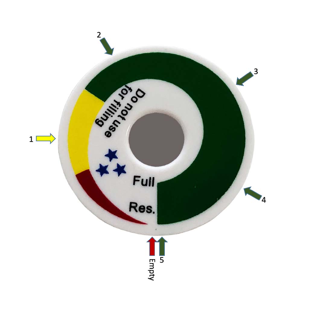 Die Gasinhaltsanzeige auf einer Gaslow Multivalve-Flasche ist die genaueste Inhaltsanzeige, die es derzeit gibt. Das Gaslow Multivalve zeigt die verbleibende Gasmenge oberhalb des Ventils an. Um jederzeit ein bequemes Ablesen zu ermöglichen, ist die Anzeige um 360 Grad drehbar. So ist der Befüllungsstand auch in schwer einsehbaren Gasflaschenschränken ablesbar.